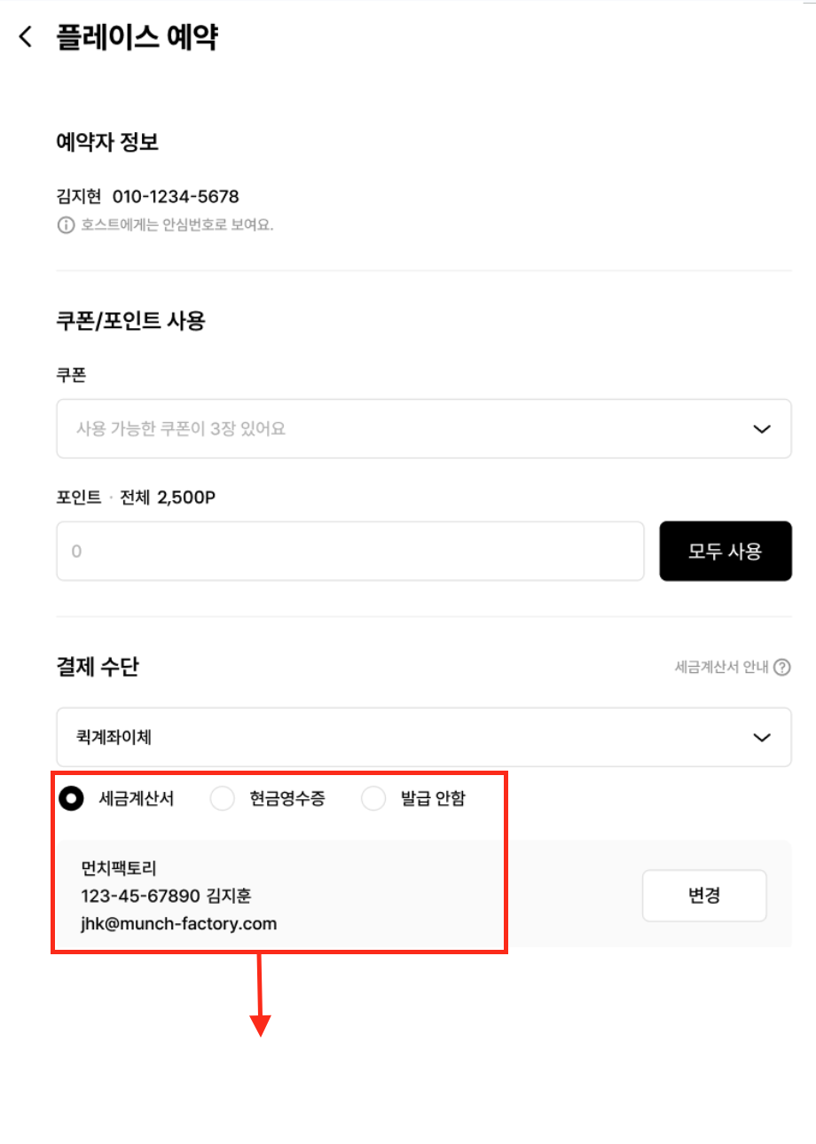 가상계좌 또는 퀵계좌이체 선택하여 결제완료→ 예약번호 + 변경 사항(예: 사업자번호 변경)을 고객센터로 전달